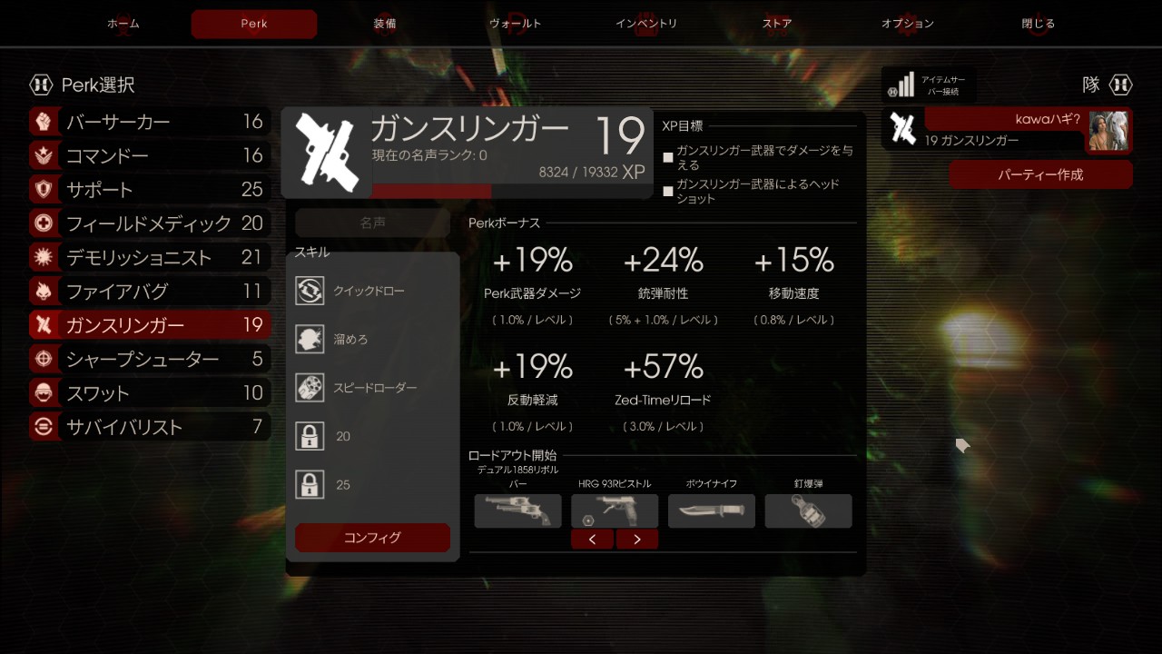 エンドレスモードのマルチでひたすらガンスリンガーをレベル上げし、17から19へ。かなりの時間プレイしたと思います。