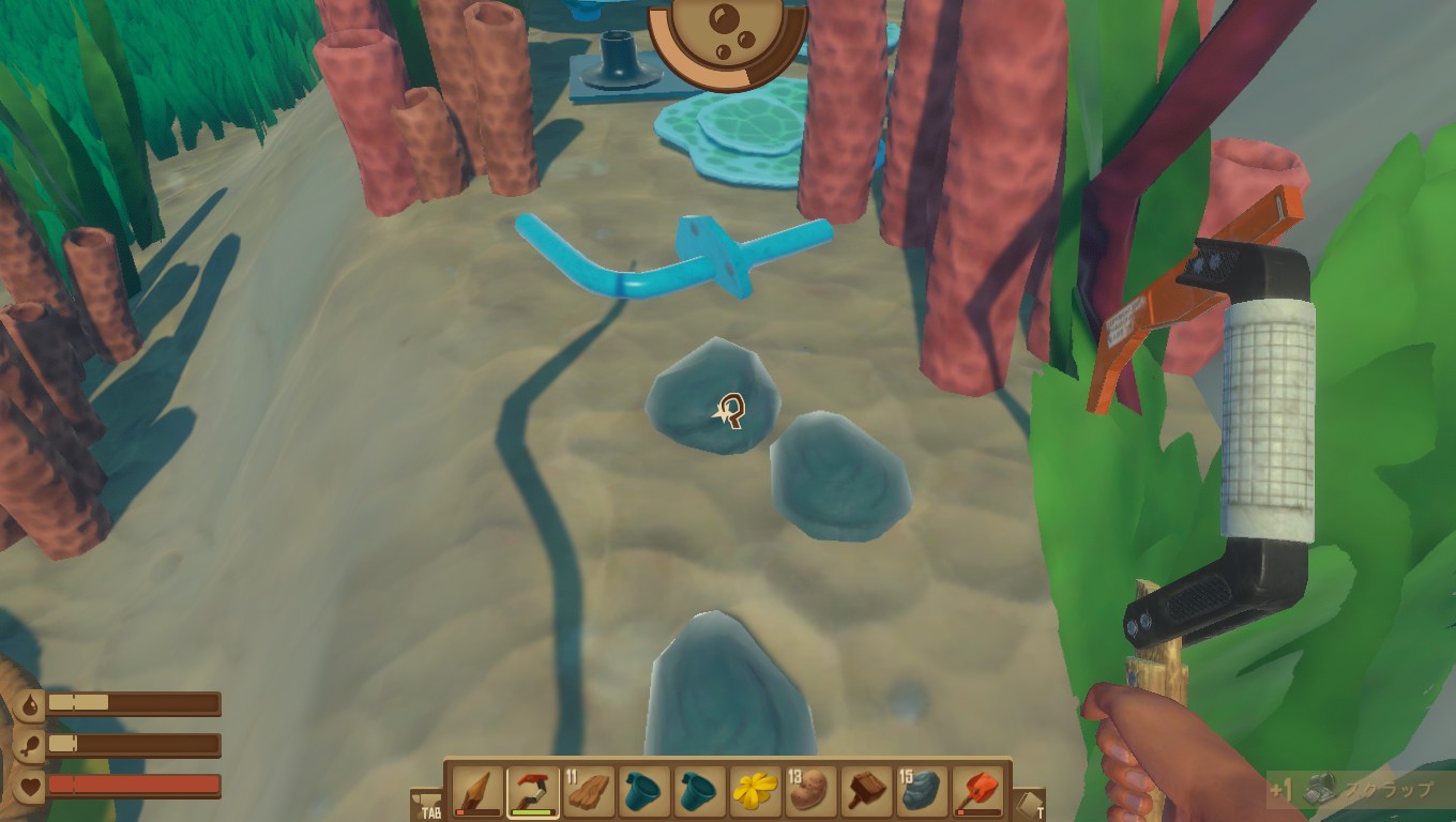 フックは水中では長押しで石や砂、鉱石などが取れます。